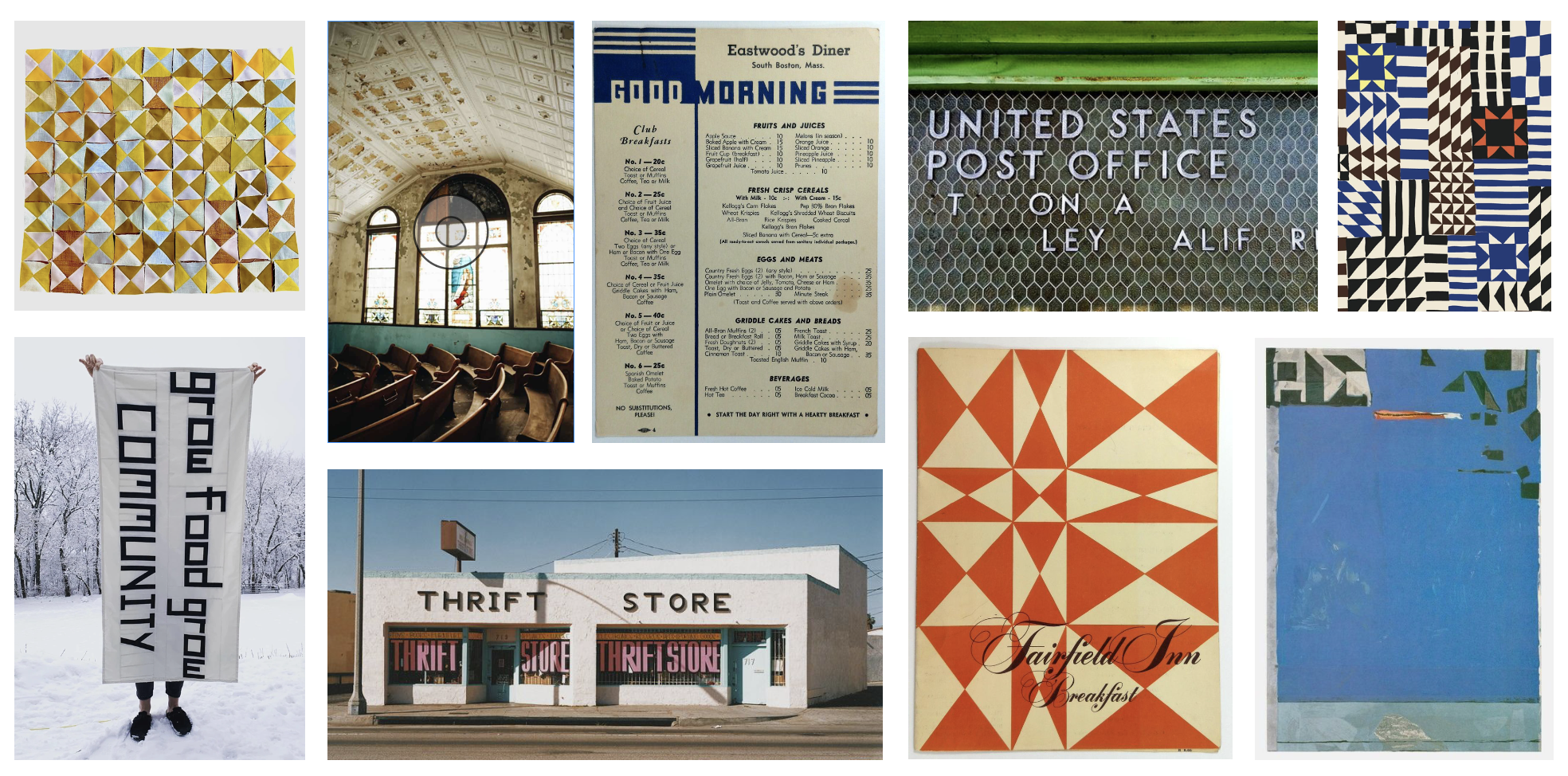 US Postal Service Art Deco type, vintage diner menus, patchwork quilts, weathered and loved space textures, and contrasting color palettes are offering a starting point as I start design.