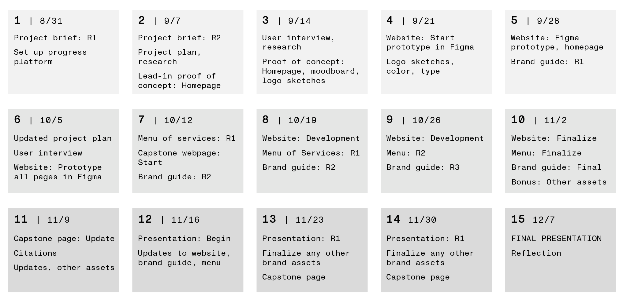 Above is my updated project plan. The biggest change this reflects is my decision to start with the Rural Design Studio brand platform, rather than the website prototype. I am still sticking with the idea that the baseline for my website will be a Figma prototype, and the ideal an actual live and developed website. This is something I’m having a hard time assessing how much time I’ll need, especially since I want to simultaneously have some other collateral created, at minimum, a diner menu of services.