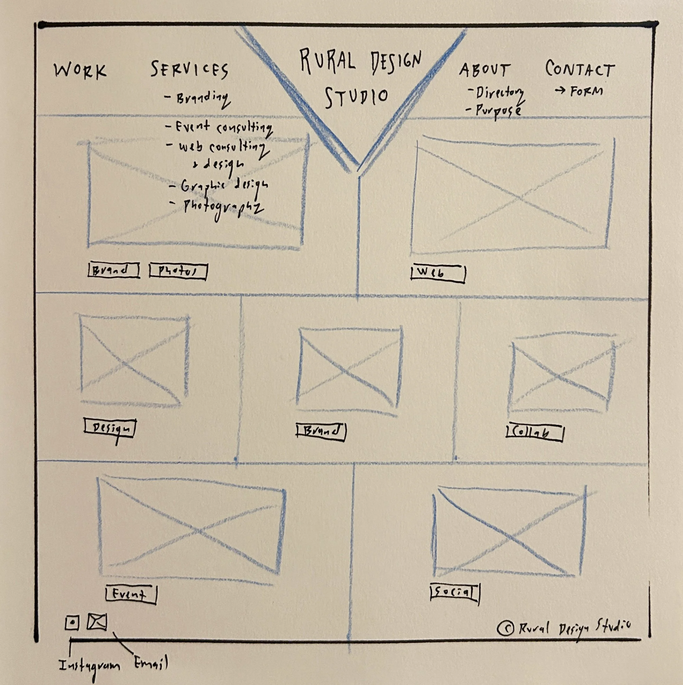 A loose start of a homepage wireframe. This should be a fairly shallow site, with more time spent on design than site architecture.